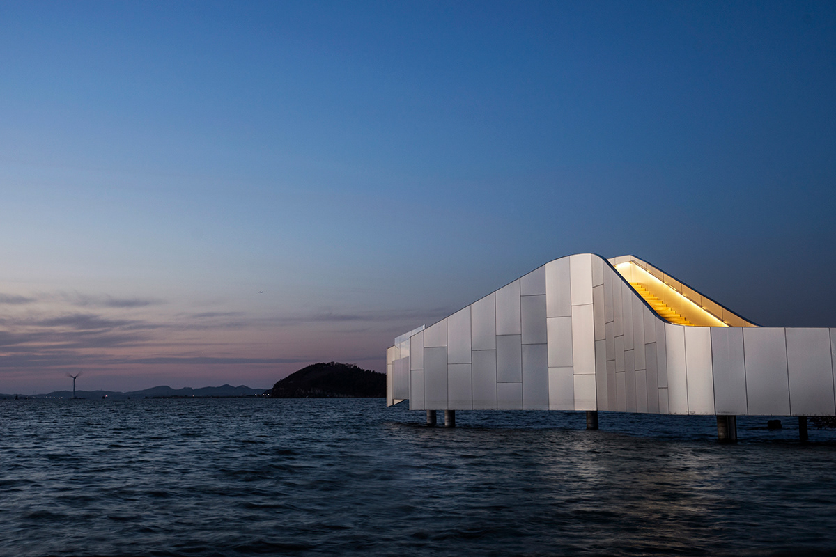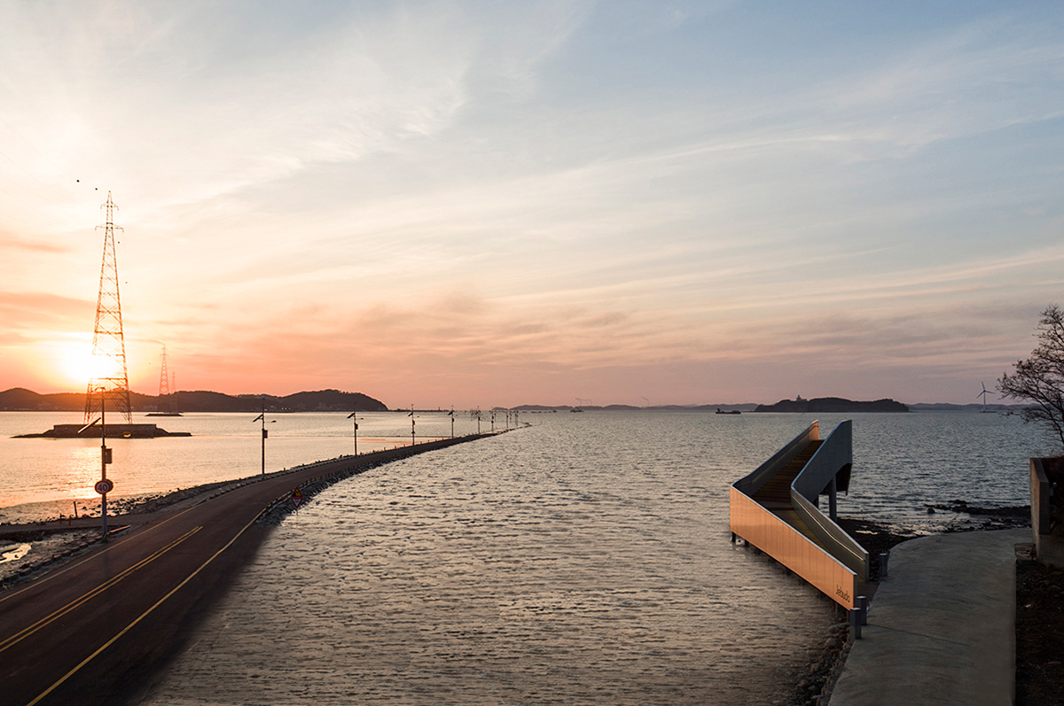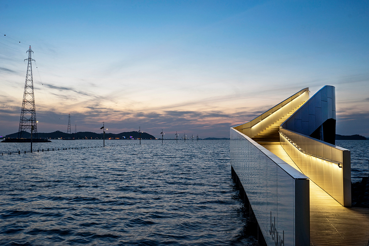 제부도는 하루에 두 번씩 바닷물이 갈라지면서 길이 열리는 기적의 섬이다. 그 바닷길 시작점에 위치한 ‘워터워크’는 밀물 때엔 바다 위를 산책하며 물때와 함께 변화하는 경관을 감상할 수 있는 길이 되어주고, 썰물 때엔 갯벌과 함께 드러나는 제부도 섬 전체 경관을 조망할 수 있는 플랫폼이 되어준다. 시간에 따라 계속적으로 변화하는 제부도의 경관을 여행객들이 가장 가까이에서 경험할 기회를 선사한다. 길이 44m 높이 최고 8m의 ‘워터워크’는 바다와 석양 등 섬의 고유한 경관을 반사, 투영시키는 소재를 사용하고, 바다의 물결과 기적과 같이 매일 열리고 닫히는 물길의 모습을 닮아있다. 이렇게 건축과 자연경관의 경계 없이 하나가 되어 시간에 따라 계속해서 변화하는 조형적인 ‘풍경’이 되어준다.